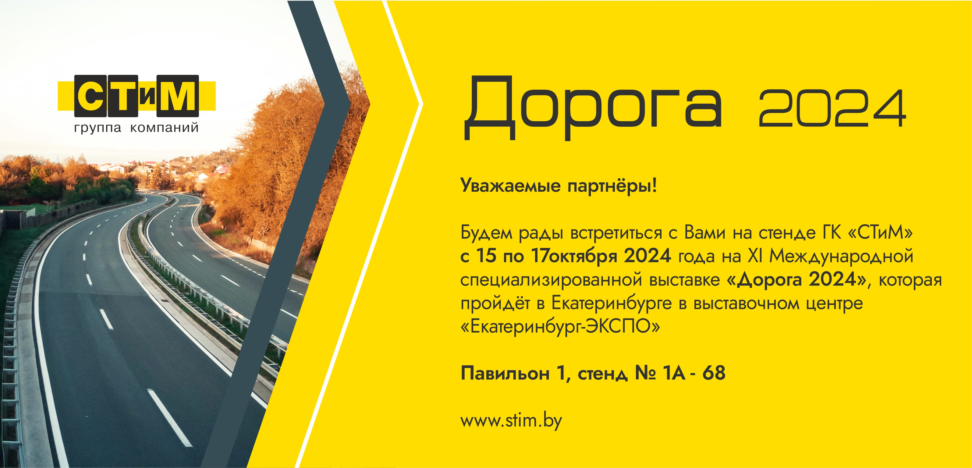 С 15 по 17 октября «СТиМ» примет участие в XI Международной специализированной выставке «Дорога 2024», которая пройдет в МВЦ «Екатеринбург-ЭКСПО». |